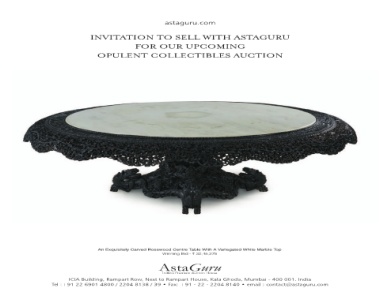 astaguru.com INVITATION TO SELL WITH ASTAGURU FOR OUR UPCOMING OPULENT COLLECTIBLES AUCTION An Exquisitely Carved Rosewood Centre T able With A Variegated White Marble T op 32,48,275 H Winning Bid - ICIA Building, Rampart Row, Next to Rampart House, Kala Ghoda, Mumbai - 400 001. India Fax: +91 - 22 - 2204 8140 • T el :+91 22 6901 4800 / 2204 8138 / 39