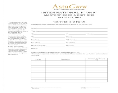 “I request AstaGuru, without legal obligation on its part, to bid on the Lots listed below, up to the maximum price I have specified. I agree that my bid will be treated as an offer and is subject to the terms and conditions listed in the catalogue and on www.astaguru.com I understand that AstaGuru is accepting written bids for the convenience of clients and I will not hold them liable for failure to record my bid. I understand that a Maximum Bid once r