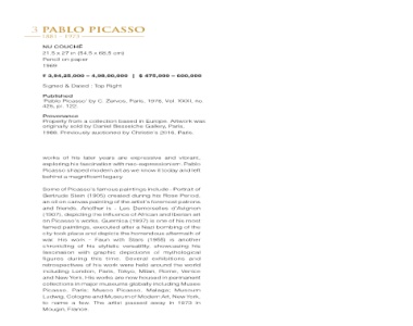 | ,000 by C. Zervos, Paris, 1976, Property from a collection based in Europe. Artwork was originally sold by Daniel Besseiche Gallery, Paris, Previously auctioned by Christie’s 2016, Paris. are with we as art legacy. paintings created the of Les - is of influence Guernica after the Stars with versatility, stylistic depictions Several time. were work T okyo, now are museums Picasso, of Museum passed artist