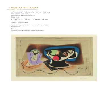 : 146/300) 16 867 , PABLO PICASSO 5 1881 - 1973 : 15/50) (Ed FAUTEUIL NU AU | 1966 quatint | A cm) 40 x .7 in (53.5 15 x 21 12,000 – 9,96,000 | $ 9,300 – 7,71,900 K Right Signed : Bottom Published . (another) Catalogs Raisonné : Baer 1414. Bloch 1392 Provenance . Artwork Spain Property from a collection based in originally from the collection of Galerie Lelong, Paris. This lot is accompanied with