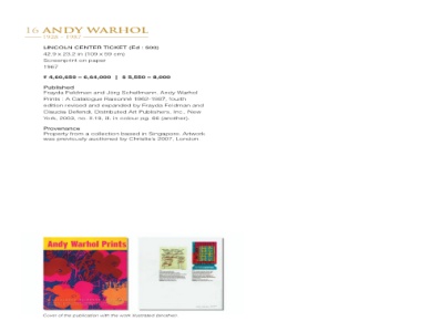 TICKET $ | ,000 Frayda Feldman and Jörg Schellmann, Andy Warhol Prints : A Catalogue Raisonné 1962-1987, fourth edition revised and expanded by Frayda Feldman and Claudia Defendi, Distributed Art Publishers, Inc., New was previously auctioned by Christie's 2007, London.