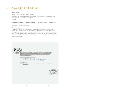 | ,000 Property from a collection based in Europe. Originally from the collection of Nachlass des Künstlers. Artwork was previously auctioned by Galerie Kornfeld Auktionen AG, 2020, Bern BE, Switzerland. This lot is accompanied with a certificate of authenticity issued by The Comité Certificate of authenticity issued by The Comité Marc Chagall.