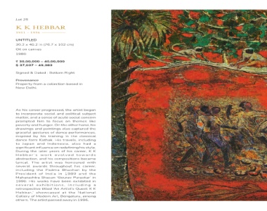 K K HEBBAR ---------------- 1996 30.2 x 40.2 in (76.7 x 102 cm) 0,00,000 4 – 0,000 49,383 – Bottom Property from a collection progressed, career and social acute of sense a and focus to him the On hunger. and paintings and dance of gestures training his by His Kathak. Indonesia, and significant influence on redefining his style. of years later the e v o l v ed w ork ’ s his and was artist The throughout awards Padma the in