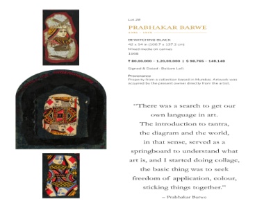 ------------------------------------ in (106.7 x 137.2 cm) |$ 0,00,000 Left based in acquired by the present owner directly from the artist. “There was a search to get our own language in art. The introduction to tantra, the diagram and the world, in that sense, served as a springboard to understand what art is, and I started doing collage, the basic thing was to seek sticking things together.” Prabhakar Barwe