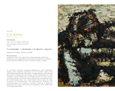 S H RAZA ------- - 2016 33 x 41.7 in (84 x 106 cm) Oil on paper laid on board 1,25 – 0,000 Signed & Dated : Bottom Right Property from an Artwork was originally auctioned by artistic Raza’s creative the the filtered establish to aided spirit he simultaneously, that knowledge equilibrium, of of space the seminal properties.