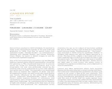 36 - 2013 THE CLOWN Tempera on canvas 0,000 ,0 Provenance Art Gallery. Ganesh t at graduated animation Working his of folklore growing by works imagination. violence the artist throughout heavily School, Pyne’s melancholia, from light mysterious