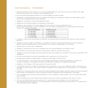 TERMS listed below and on the website www.astaguru.com Securing the Winning Bid results in an enforceable contract of sale. lots in the catalogue and on the website. AstaGuru can grant, record and reject any bid. Bidding access shall be given at AstaGuru's discretion. deposit security Security Deposit 2,00,000 3,00,000 5,00,000 10,00,000 The Auction House Margin shall be calculated at 18 during rates exchange All invoicing details should be provided by the buye