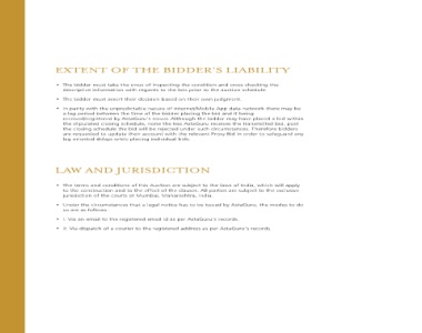LIABILITY Condi ons of Sale; any of authority the under ac ng Person or Authority Governmental India, in authority statutory any of and/or Authority Governmental be shall and convenience for only are typeface bold and headings e) whether in effect on the Execu on Date or thereaer; ignored for the purpose of interpreta on; auc on online an mean shall “aucon") (or Aucon” “AstaGuru b) reference to legisla on or law or to any provi