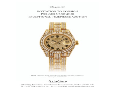 astaguru.com INVITATION TO CONSIGN FOR OUR UPCOMING 18K Yellow Gold & Diamond Oyster Perpetual Lady Datejust Wristwatch INR 34,15,500 Winning Bid - ICIA Building, Rampart Row, Next to Rampart House, Kala Ghoda, Mumbai - 400 001 Fax: +91 - 22 - 2204 8140
