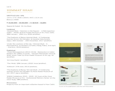 18,519 $ | ‘Himmat Shah : Hammer on the Square - A Retrospective at Kiran Nadar Museum of Art, New Delhi, ‘The Euphoria of Being Himmat Shah : A Continuing Jaipur, 30th October - 15th December, 2017 (another). ‘Three Retrospectives (2013-2016) : Abstraction in Indian 1960s onwards - Nasreen Mohamedi, Himmat Kiran Nadar Museum of Art, 29th January, 2016, Issue (another). 'The Euphoria of Being Himmat Shah : A Continuing ‘KNMA Exhibitions 2010 - 202