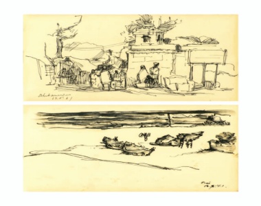 GANESH PYNE --------------------- - 2013 - TRAVEL TO BOOK PURI & BHUBANESWAR cm) 22 x 3 4. in (1 Ink & wash, pencil & pen on paper 0,00,000 8 – 0,000 This lot is a set of 82 'Ganesh Pyne Chobi’ pgs. 112, 119, 120 & 147. 'Ganesh Pyne Chobi’ Property from an important collection of the publications.