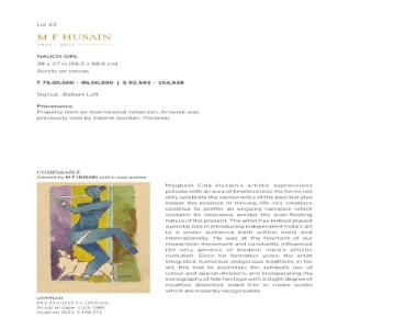 M F HUSAIN --------------- GIRL 68.6 x 96.5 in ( on canvas 5 8 – 0,000 Left Property from an international previously sold by M F HUSAIN 84 x 53 in (213.4 x 134.6 cm), Acrylic on paper, Circa 1980 $ 198,172 , 2021