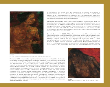 WORKS embraced Padamsee phase early the his as However from away the into poetic his emotions the until wasn’t NU & FLEURS 47 x 48 in (119.4 x 121.9 cm), Oil on canvas, 1965 the to figures works that aimed to capture its profound emotive essence. his into glimpse nude the where interplay, striking a the setting by variations tonal quality, transcendental realm innermost thought-provoking. thick the