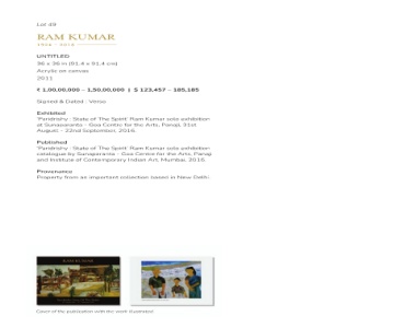 RAM KUMAR ----------------- - 2018 91.4 4 x in (91. on canvas 1,5 – 0,000 : Verso & Dated ‘Paridrishy : State of The Spirit’ August - 22nd September, 2016. ‘Paridrishy : State of The Spirit’ Property from an important collection Cover of the publication with the work illustrated.