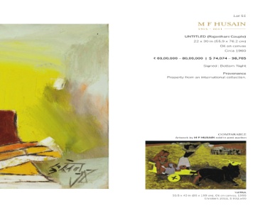 M F HUSAIN - - - 5 - 2011 (Rajasthani Couple in (55.9 x 76.2 Oil 74,074 $ Signed : Bottom Right international 33.5 x 43 in (85 x 109 cm), Oil on canvas, 1955 11, 20 Christie's