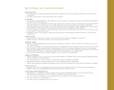 BUYING AT Estimates • These are provided only as a guide for Buyers. • • independent research. • Reserves • • Margin hammer the to addition In • winning bid value on each lot. are taxes lots, all For • applicable rate, included in the invoice. Bidding Pre–Registration and Verification • • for the sale. (Use your previous login Id). • • • AstaGuru may (i) request a • (in the event the buyer is a non-resident) deposit are as the following. 2,00,