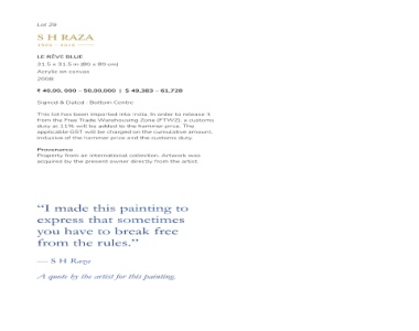 S H RAZA - 2016 BLUE 31.5 in ( on canvas – 0, 000 Signed & Dated : Property from an