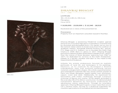BHAGAT -------------------------------- cm) 59.4 12,346 $ | ,00,000 Illustrated are 2 views of the presented lot. pioneering figurative forms. elongated break to artists Kanwal Alongside he Kulkarni, Lahore in pursued sculpture studies at the Mayo College of Art, Lahore. decades, three services his and member endeavours and life he evolved, involved that His shapes. clay, like materials papier fibreglass, Additionally, steel. mythology Ind
